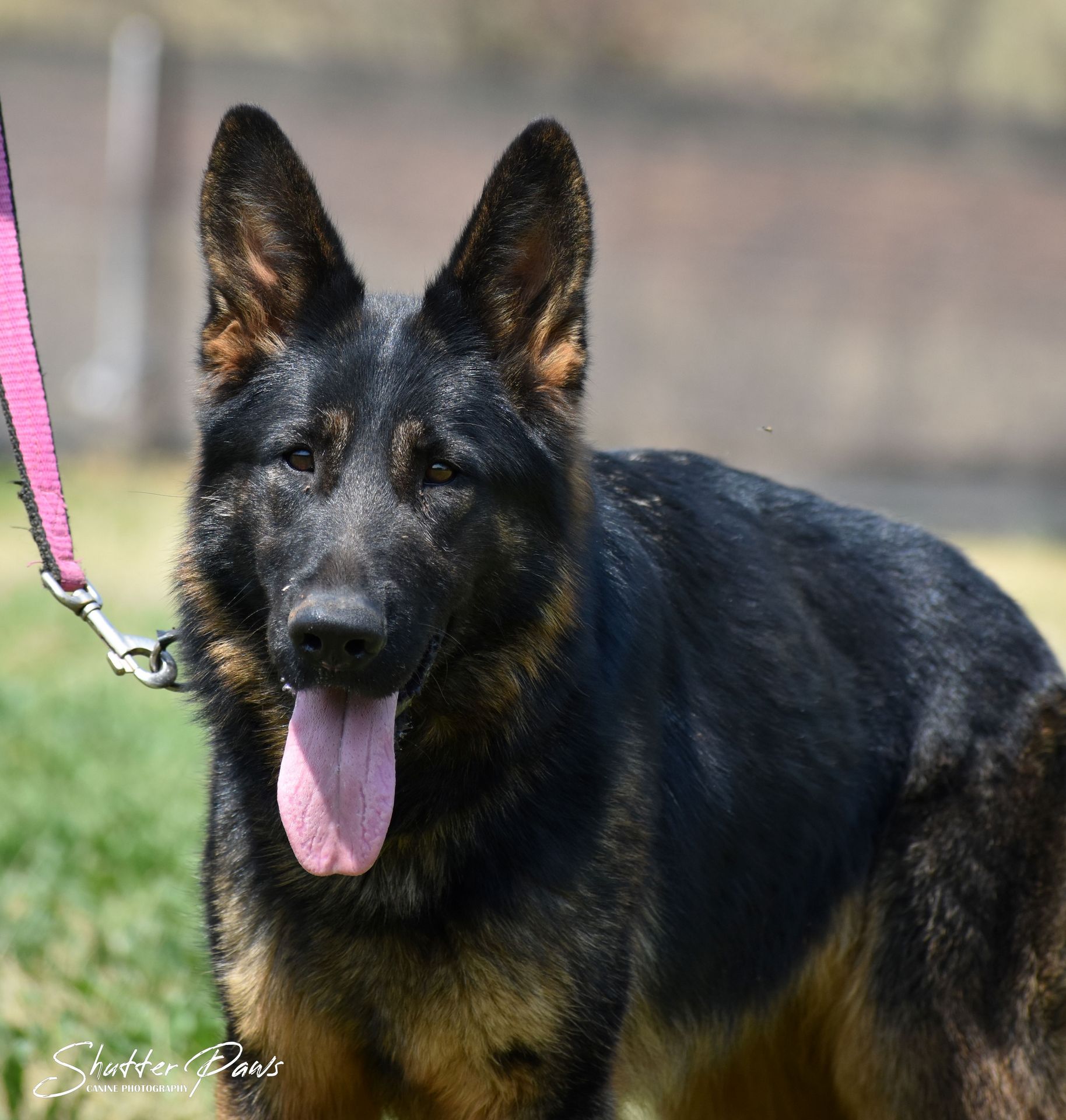An upper medium sized, medium strong, substantial female with very good pigmentation. Good head and expression with dark eyes. High wither, straight back. The croup is short and steep. Very good hind angulation, the upper arm should be longer and better angulated. Correct going and coming. Good hind thrust and forward reach.