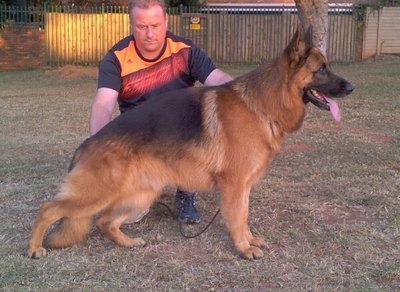 Large, powerful, substantial, well-proportioned male with a powerful, masculine head. High wither, straight back, good length and lay of the croup. Good angulations, the underline could be slightly longer, correct in front, correct going, correct coming, very good hind trust and good forward reach, balanced side gait. Drive, self-assurance and stress-tolerance (TSB) pronounced; dog does not release. RS2014: TSB pronounced, dog does not release.